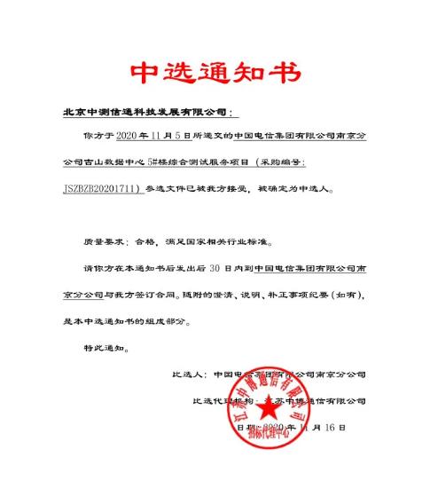 剛剛告別了金秋十月,我們便踏上了新的征程,在中測信通全體員工的努力下,我司再次一舉中標(biāo)“中國電信集團(tuán)有限公司南京分公司吉山數(shù)據(jù)中心5#樓綜合測試服務(wù)項(xiàng)目”。