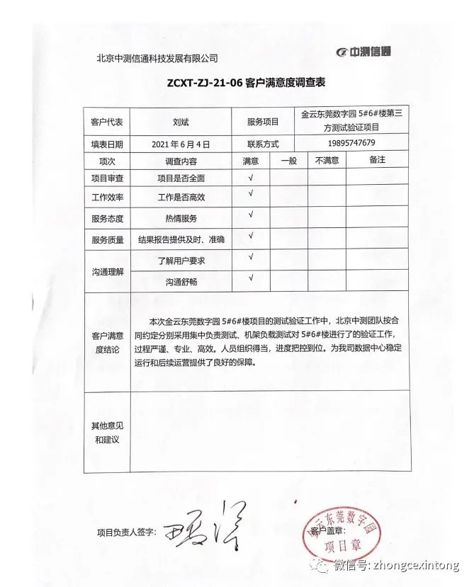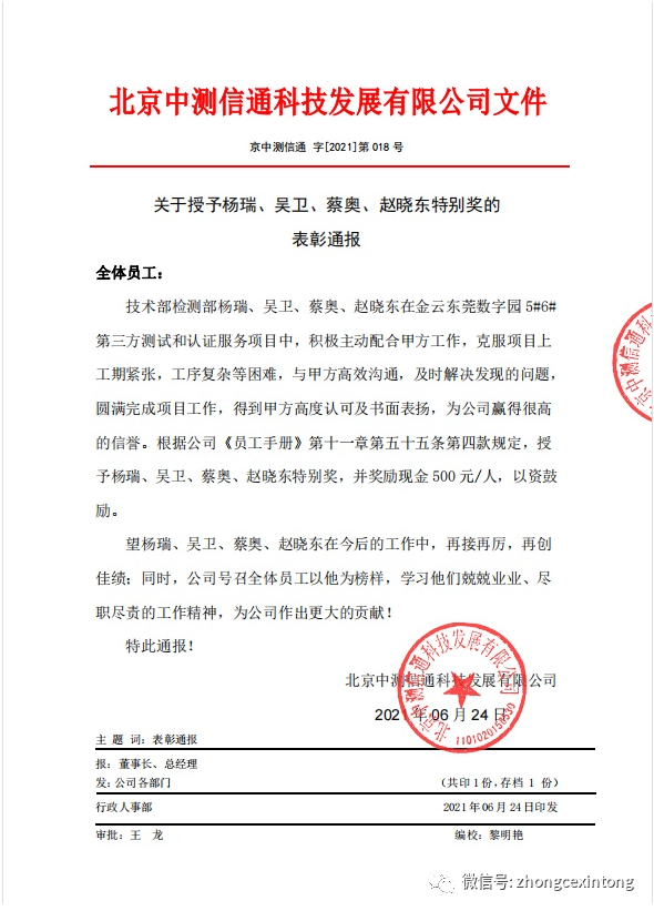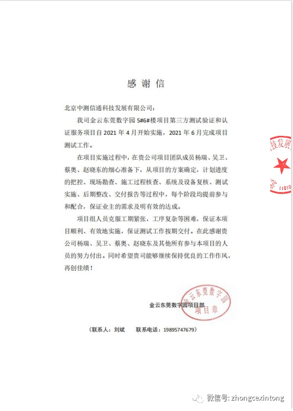 近期我司收到了來(lái)自金云東莞數(shù)字園工程部感謝信。信中對(duì)北京中測(cè)信通科技發(fā)展有限公司的專(zhuān)業(yè)服務(wù)和積極配合完成項(xiàng)目任務(wù)的工作態(tài)度給予了高度的認(rèn)可!霸陧(xiàng)目中楊瑞、吳衛(wèi)、蔡奧、趙曉東認(rèn)真負(fù)責(zé)、積極配合、克服項(xiàng)目上的重重困難,加班加點(diǎn)任勞任怨,在項(xiàng)目實(shí)施過(guò)程中能夠高效溝通,及時(shí)解決發(fā)現(xiàn)的問(wèn)題,保證了項(xiàng)目的順利進(jìn)行,對(duì)此我司特此提出表?yè)P(yáng)”。在此非常感謝金云東莞數(shù)字園工程部對(duì)我們的認(rèn)可,我們會(huì)不斷的努力完善自己。向中國(guó)數(shù)據(jù)中心服務(wù)的標(biāo)桿企業(yè)邁進(jìn)。