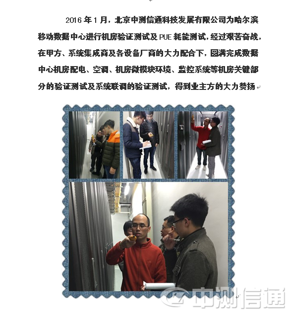 2015年8月,北京中測信通科技發(fā)展有限公司為哈爾濱移動數(shù)據(jù)中心進(jìn)行機(jī)房驗(yàn)證測試及PUE耗能測試,經(jīng)過艱苦奮戰(zhàn),在甲方、系統(tǒng)集成商及各設(shè)備廠商的大力配合下,圓滿完成數(shù)據(jù)中心機(jī)房配電、空調(diào)、機(jī)房微模塊環(huán)境、監(jiān)控系統(tǒng)等機(jī)房關(guān)鍵部分的驗(yàn)證測試及系統(tǒng)聯(lián)調(diào)的驗(yàn)證測試,得到業(yè)主方的大力贊揚(yáng).