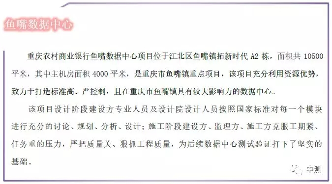 2018年9月26日,由北京中測信通科技發(fā)展有限公司提供檢測驗證服務的“重慶農村商業(yè)銀行魚嘴數(shù)據(jù)中心”,成功榮獲CQC(中國質量認證中心)數(shù)據(jù)中心場地基礎設施評價增強級(GB50174-2008 A級)認證。