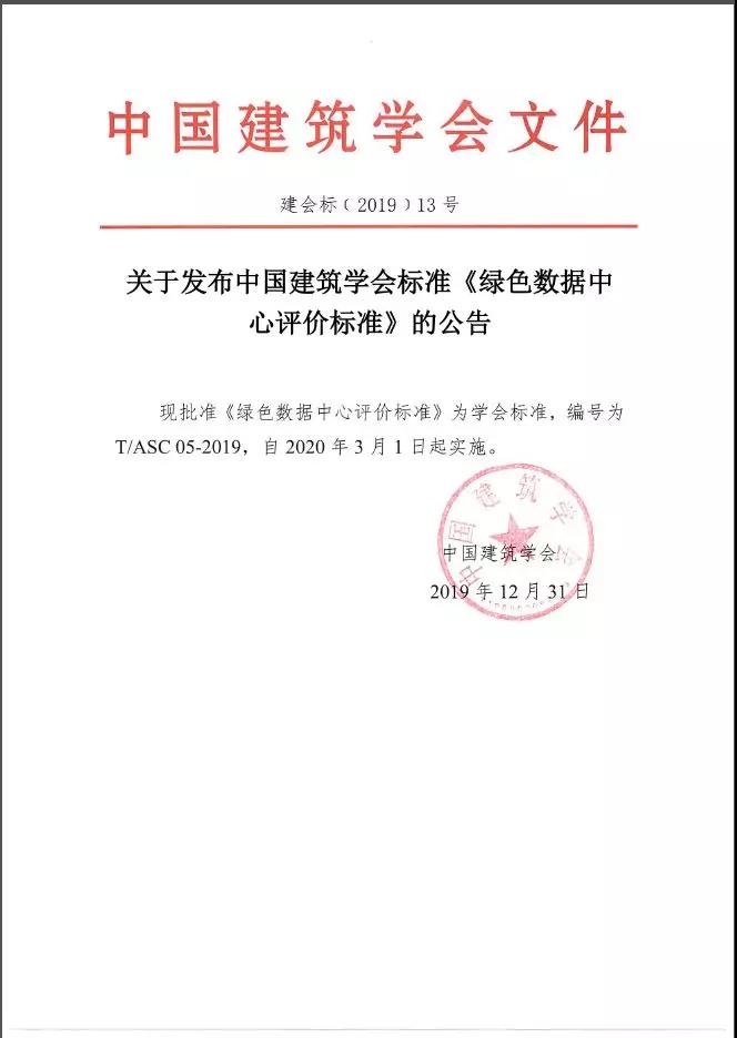 2019年12月31日,由中國建筑科學研究院有限公司主編的《綠色數據中心評價標準》經中國建筑學會批準通過,定于2020年3月1日起正式實施,標準編號為T/ASC 05-2019,歡迎大家索取電子版,并采購該標準的正式出版物。