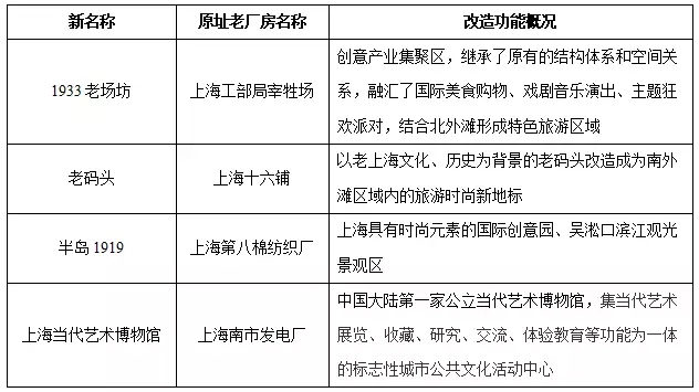 近年來(lái),一大批老廠房被重新包裝,脫胎換骨,煥發(fā)出新的生機(jī)和活力,凸顯了“老建筑、老廠房、新產(chǎn)業(yè)、新生命”的格局,目前上海地區(qū)老廠房改造成的商業(yè)創(chuàng)意產(chǎn)業(yè)集聚區(qū)約有50個(gè),其中典型的幾個(gè)改造案例如表1。