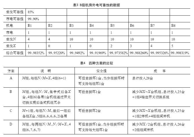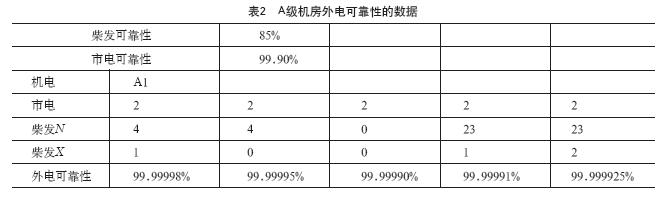 從字面上,不管N是6臺還是12臺還是18臺,后備1臺都可以視為滿足規(guī)范要求;但是有朋友按照空調末端冗余N+X,N>4常規(guī)備用2臺的實踐經(jīng)驗,覺得實際末端可靠性在90%,而實際柴發(fā)可靠性也約在80%~90%之間,覺得4臺以上也應該備用2臺。表2和表3分別給出了柴發(fā)可靠性經(jīng)驗值為85%,市電可靠性經(jīng)驗值為99.90%時,A級機房和B級機房外電可靠性的數(shù)據(jù)。