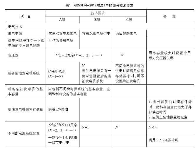 在GB50174-2017《數(shù)據(jù)中心設計規(guī)范》的附錄1《各級數(shù)據(jù)中心技術要求》的“電氣技術”中,對數(shù)據(jù)中心備用電源系統(tǒng)作出了具體的技術要求,見表1。