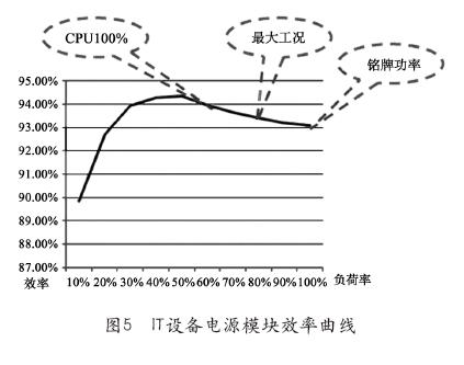 從圖5中可以注意到服務(wù)器最大工況是銘牌額定值的80%,這是因?yàn)榉⻊?wù)器廠家在選擇電源模塊時(shí)考慮20%的功率富余。而典型工況大概是銘牌額定值的67%。事實(shí)上服務(wù)器正常工作時(shí)的功耗小于典型工況。參見(jiàn)圖5,以電源模塊負(fù)載率50%為對(duì)稱軸,負(fù)載率高于50%時(shí),效率值略有下降,但高于對(duì)稱負(fù)載率低于50%處。假定電源模塊損耗可分為固定的空載損耗和可變的負(fù)載損耗,根據(jù)實(shí)際測(cè)試數(shù)據(jù),空載損耗可控制不高于銘牌額定值的1.5%左右;谝陨先齻(gè)因素,IT設(shè)備雙路電源模塊選在主備模式時(shí)(主用模塊負(fù)擔(dān)100%,熱備模塊負(fù)擔(dān)0%),整體工作效率處于最佳狀態(tài)。