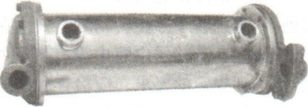 水冷式潤滑油冷卻裝置的實物外形及零件分解如圖6-36和圖6-37所示。它主要由芯子和殼體組成。芯子由黃銅管、散熱片和隔片組成。潤滑油在芯子與殼體的夾層之間流動。冷卻液在芯子內(nèi)部流動時,帶走潤滑油的部分熱量。經(jīng)過冷卻液的循環(huán)往復流動,使油溫控制在80·C±5·C范圍內(nèi)。
