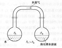 吸收式制冷機(jī)內(nèi)采用的工質(zhì)是由低沸點(diǎn)物質(zhì)和高沸點(diǎn)物質(zhì)組成的工質(zhì)對。其中低沸點(diǎn)物質(zhì)作為制冷劑,高沸點(diǎn)物質(zhì)作為吸收劑。在氨水溶液吸收式制冷機(jī)中,氨為制冷劑,水為吸收劑。在溴化鋰水溶液吸收式制冷機(jī)中,水為制冷劑,溴化鋰為吸收劑。目前廣泛使用的是溴化鋰水溶液吸收式制冷機(jī)。溴化鋰的沸點(diǎn)很高(1265℃),在鎳化鋰水溶液上方的蒸氣幾乎全部為水蒸氣,而溴化鋰溶液中的浪化錘分子對水分子的吸引作用很強(qiáng),使溶液上方水蒸氣的飽和壓力較之同溫度下水的飽和蒸汽壓力低得很多。由于溴化鋰溶液和水之間存在蒸汽壓力差,溴化鋰溶液即吸收水的蒸汽,如圖1所示。水則進(jìn)一步蒸發(fā)吸收熱量,使本身溫度降低到對應(yīng)的較低壓力的蒸發(fā)溫度從而實(shí)現(xiàn)制冷目的。