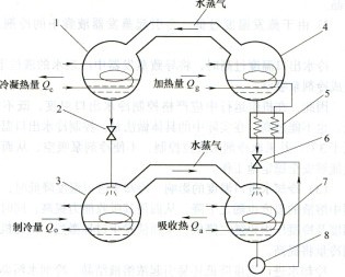 1-吸冷器2-節(jié)流閥3-蒸發(fā)器4-發(fā)生器5-溶液熱交換器6-減壓閥7-吸收器8-溶液泵