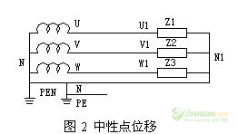 1.2   三相不平衡且中性線斷線、未接好或阻抗較大導(dǎo)致中性點(diǎn)位移