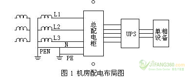 按照GB50174——93《電子計(jì)算機(jī)機(jī)房設(shè)計(jì)規(guī)范》,機(jī)房應(yīng)采用TN-C-S方式配電。進(jìn)入建筑物以前為TN-C,進(jìn)入后采用TN-S制,如圖1所示。若單相負(fù)荷嚴(yán)重不平衡,即相電流幅值不等,夾角不為120度,則流入中線中的電流較大,最大時(shí)可接近相電流。而由于中線阻抗的存在,中線電流在阻抗上就會(huì)產(chǎn)生電位差。零線上遠(yuǎn)離進(jìn)線端的點(diǎn),相對(duì)于地電位就可能較高。