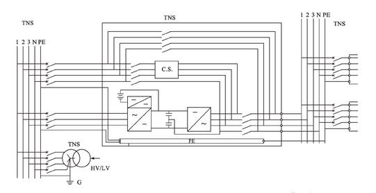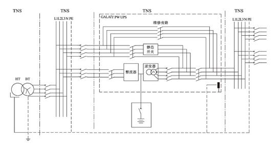 從圖1中可以看出,在UPS上下線都是TN-S接地方式時(shí),由晶閘管整流器組成的UPS或稱之為工頻機(jī)(無論這個(gè)稱呼是否準(zhǔn)確),其中性線N是由UPS的旁路輸入端引入的,并且與逆變變壓器(而不是起“隔離”作用的變壓器)的中性點(diǎn)直接連接,作為UPS輸出的中性線。這種連接方式的目的是:由于UPS的靜態(tài)旁路時(shí)時(shí)刻刻處于“待切換”的鎖相同步狀態(tài),當(dāng)負(fù)載需要從逆變器供電切換到由靜態(tài)旁路供電(或相反切換)時(shí),為了避免兩路交流電源切換時(shí)由于基準(zhǔn)電位不一致而產(chǎn)生較大的環(huán)流,導(dǎo)致切換失敗,因此這兩路電源的基準(zhǔn)電位必須是一致的,在電路上是采用同一條中性線的連接作為基準(zhǔn)電位來保證。